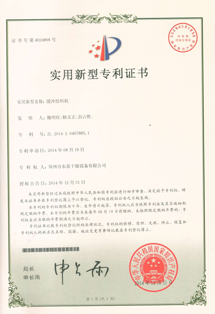 煤泥烘干機緩沖給料機獲得國家 , 號:ZL 2014 2 0467885.1,目前我公司已成功申報各項發(fā)明及適用新型 50多項,成為中原地區(qū)干燥裝備行業(yè)標桿企業(yè),并成功申報國家高新技術(shù)企業(yè),河南省科技型中小企業(yè)。2015公司將再接再厲加大科技轉(zhuǎn)化為客戶提供更加有競爭力的產(chǎn)品。