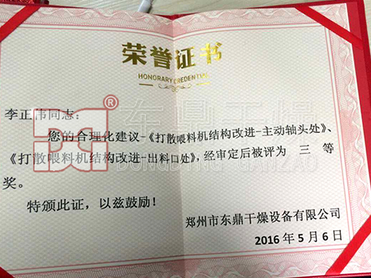用心澆筑在平凡的崗位上綻放光彩,拒絕平庸勇于創新,這是我司駐內蒙古燎原煤泥烘干機項目托管現場的小伙子們的精彩宣言,熱烈祝賀李工打散喂料機結構改進-主動軸頭處、出料口處合理化建議廣受單位同事及業主方好評,通過此處改進實現了打散內構的快速換裝,大大縮短維修成本,并保證了不同煤炭物料的快速連續通過,實現了順暢給料。做為連續在項目托管現場待了3年多的李工,從一個懵懵懂懂的項目管理見習人員迅速成長為一個技術創新能手,和他個人的努力是密不可分的,為了能和公司快速成長,李工常常利用大家休息的時間針對日常發現的現場管理問題進行細心琢磨鉆研,并結合實踐嘗試創新,目前該改進創新已在東鼎干燥其他托管工地推廣使用。